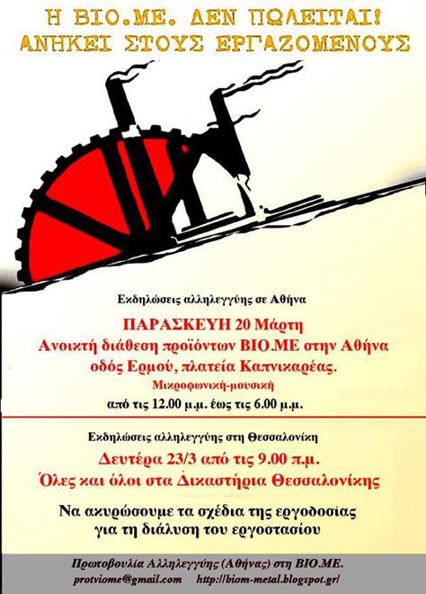 Η δράση οργανώνεται ενόψει της δίκης της Δευτέρας 23/3 όπου επιχειρείται από την πρώην εργοδοσία να ξεκινήσει η διαδικασία εκποίησης του εργοστασίου της ΒΙΟΜΕ.