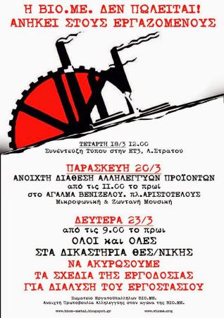Την Παρασκευή η Πρωτοβουλία Αλληλεγγύης στην ΒΙΟΜΕ διοργανώνει ανοιχτή διάθεση προϊόντων στο άγαλμα Βενιζέλου με μικροφωνική και ζωντανή μουσική. Την Δευτέρα η πρωτοβουλία καλεί όλη την κοινωνία της Θεσσαλονίκης να σταθεί στο πλευρό των εργαζομένων στην κρίσιμη δικαστική μάχη με συγκέντρωση αλληλεγγύης έξω από τα δικαστήρια.