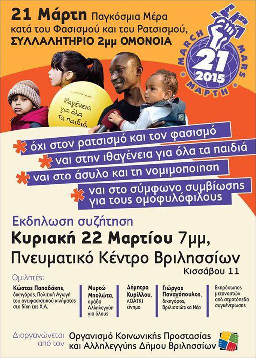 Εκδήλωση – συζήτηση με αφορμή τη σημερινή Παγκόσμια Μέρα κατά του φασισμού και του ρατσισμού πραγματοποιεί την Κυριακή 22/3 στις 7μ.μ. ο οργανισμός Κοινωνικής Προστασίας και Αλληλεγγύης του Δήμου Βριλησσίων, στο Πνευματικό Κέντρο, Κισσάβου 11. Την Αλληλεγγύη για Όλους θα εκπροσωπήσει η Μυρτώ Μπολώτα, η οποία θα μιλήσει για το πως η δράση αλλά και η ύπαρξη των δομών κοινωνικής αλληλεγγύης αποτελούν ανάχωμα στο φασισμό.