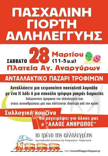 Αποκτήστε υπέροχες λαμπάδες που είναι φτιαγμένες στο εργαστήρι χειροτεχνίας του "Τρένου της Αλληλεγγύης" (28/3,11-5μ.μ., στην πλατεία Αγ. Αναργύρων) προσφέροντας 1 λίτρο λάδι ή μία σακούλα τρόφιμα. Στις 12 μ.μ. θα μαγειρέψει για όλους μας ο "Άλλος άνθρωπος". Σας περιμένουμε!