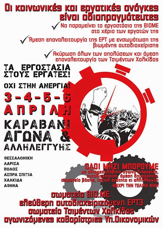 Τα σωματεία της ΒΙΟΜΕ, των Τσιμέντων Χαλκίδας, η αυτοδιαχειριζόμενη ΕΡΤ3 και οι αγωνιζόμενες καθαρίστριες του υπουργείου Οικονομικών συνδιοργανώνουν Καραβάνι Αγώνα & Αλληλεγγύης που θα ξεκινήσει την Παρασκευή 3 Απρίλίου από τη Θεσσαλονίκη, θα περάσει το Σάββατο 4 Απριλίου από τη Λάρισα και τον Βόλο, την Κυριακή 5 Απριλίου από Άσπρα Σπίτια στη Χαλκίδα. Θα καταλήξει το βράδυ στην Αθήνα, όπου την επομένη Δευτέρα 6 Απριλίου, θα κατευθυνθεί με διαδήλωση από τα Προπύλαια στο υπουργείο Εργασίας.