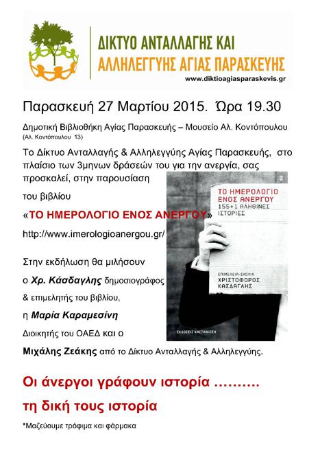 Το Δίκτυο Ανταλλαγής και Αλληλεγγύης Αγίας Παρασκευής παρουσιάζει στην Δημοτική Βιβλιοθήκη Αγίας Παρασκευής το βιβλίο "Το ημερολόγιο ενός ανέργου" την Παρασκευή 27/03 και ώρα 19,30 στο πλαίσιο των εκδηλώσεων του για την ανεργία (Μάρτιος-Απρίλιος-Μάιος).