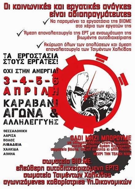 Οι Εργάτες της ΒΙΟΜΕ, των Τσιμέντων Χαλκίδας, οι εργαζόμενοι της Ελεύθερης Αυτοδιαχειριζόμενης ΕΡΤ3, οι αγωνιζόμενες καθαρίστριες του Υπ. Οικονομικών, οι σχολικοί φύλακες Θεσ/νίκης, οι καθηγητές σε διαθεσιμότητα, σωματεία, συνδικαλιστικές κινήσεις, πρωτοβουλίες, συλλογικότητες και κινήματα, ξεκινάμε ενωμένοι στις 3 Απρίλη από τη Θεσσαλονίκη (ΒΙΟΜΕ-ΕΡΤ3) μία διαδρομή αξιοπρέπειας με το "Καραβάνι Αγώνα και Αλληλεγγύης" που θα καταλήξει στις 6 Απρίλη στην Αθήνα με πορεία προς το υπουργείο Εργασίας. Ενδιάμεσοι σταθμοί: Λάρισα, Βόλος, περιφερειακές Ελεύθερες ΕΡΑ, Λιβαδειά, εργοστάσιο Τσιμέντων Χαλκίδας.