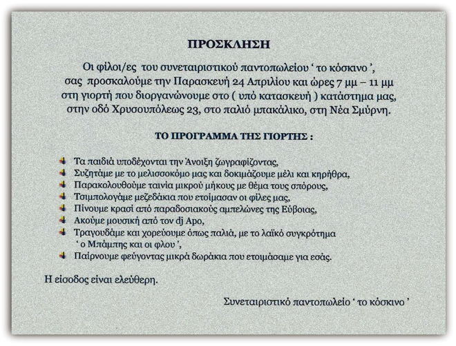 Πρόσκληση σε γιορτή στο υπό κατασκευή Συνεταιριστικό Παντοπωλείο "το κόσκινο" (25/4)