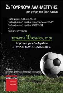 Η "Αλληλεγγύη στα Δυτικά" διοργανώνει την Τετάρτη 10/6 το "2ο ποδοσφαιρικό τουρνουά αλληλεγγύης" στη μνήμη του Τάκη Αρώνη στο γήπεδο "Σταύρος Μαυροθαλασσίτης", με τη συμμετοχή παλαιμάχων του Αιγάλεω, της ομάδας εργαζομένων ΣΤΑ.ΣΥ, της ομάδας του Sport - Fm και της Εθνικής ομάδας των Αστέγων.