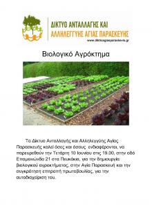 Το Δίκτυο Ανταλλαγής και Αλληλεγγύης Αγίας Παρασκευής καλεί όσες και όσους ενδιαφέρονται, να παρευρεθούν την Τετάρτη 10 Ιουνίου στις 19.00, στην οδό Επαμεινώνδα 21 στα Πευκάκια, για την δημιουργία βιολογικού αγροκτήματος, στην Αγία Παρασκευή και την συγκρότηση επιτροπή πρωτοβουλίας, για την αυτοδιαχείριση του.
