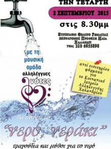 Το νερό που ξεπλένει, μελαγχολεί, κάποτε πνίγει, άλλοτε ξενιτεύει, περιγράφει η μουσικο-θεατρική παράσταση "Νερό Νεράκι" από την ομάδα "Αλληλέγγυες Νότες" που θα παρουσιαστεί την Τετάρτη 2 Σεπτεμβρίου 2015 στις 8.30 μ.μ. στο Ευριπίδειο Θεάτρο Ρεματιάς στο Χαλάνδρι.