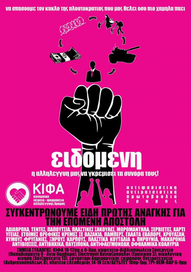 Το Κοινωνικό Ιατρείο Φαρμακείο Αλληλεγγύης Δράμας (ΚΙΦΑ) οργανώνει συχνές αποστολές αλληλεγγύης προς την Ειδομένη μεταφέροντας φάρμακα, είδη ρουχισμού και είδη πρώτης ανάγκης.