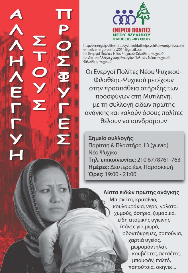 Οι Ενεργοί Πολίτες Νέου Ψυχικού - Φιλοθέης - Ψυχικού μετέχουν στην προσπάθεια στήριξης των προσφύγων στη Μυτιλήνη, με τη συλλογή ειδών πρώτης ανάγκης και καλούν όσους πολίτες θέλουν να συνδράμουν σ' αυτήν την προσπάθεια.