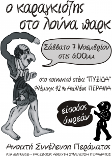Σαββατιάτικη παράσταση Καραγκιόζη με δωρεάν είσοδο (6μμ) για όλα τα παιδιά της πόλης από την Ανοιχτή Συνέλευση Περάματος, στο "Κοινωνικό στέκι Πυξίδα"! Να είμαστε όλοι εκεί!