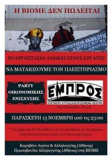 Εκδήλωση - πάρτυ οικονομικής ενίσχυσης στη ΒΙΟ.ΜΕ στο ελεύθερο αυτοδιαχειριζόμενο θέατρο "Εμπρός". Τα χρήματα που θα συγκεντρωθούν θα διατεθούν για τη μετάβαση με λεωφορείο στη Θεσσαλονίκη ενόψει του πλειστηριασμού.