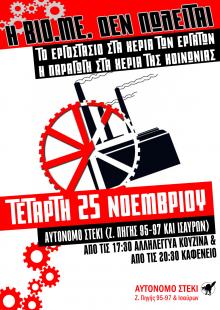 Η ΒΙΟΜΕ έχει έδαφος και γερές ρίζες που φτάνουν μέχρι την Αθήνα: αυτή την Τετάρτη 25/11 μαγειρεύουμε στη Συλλογική Κουζίνα της Τετάρτης και συναντιόμαστε στο καφενείο του Αυτόνομου Στεκιού για να ενισχύσουμε τον αγώνα των εργατών της ΒΙΟΜΕ προκειμένου να κρατήσουν το εργοστάσιο στα χέρια τους παράγοντας αγαθά για την κοινωνία, μαζί με την κοινωνία. Τα έσοδα τόσο από το κουτί της κουζίνας όσο και από το καφενείο θα ταξιδέψουν στα αδέρφια μας στη Θεσσαλονίκη ως ελάχιστη πράξη έμπρακτης αλληλεγγύης, συντροφικότητας και περηφάνιας για τις μάχες που δίνουν ως κομμάτι της τάξης μας.