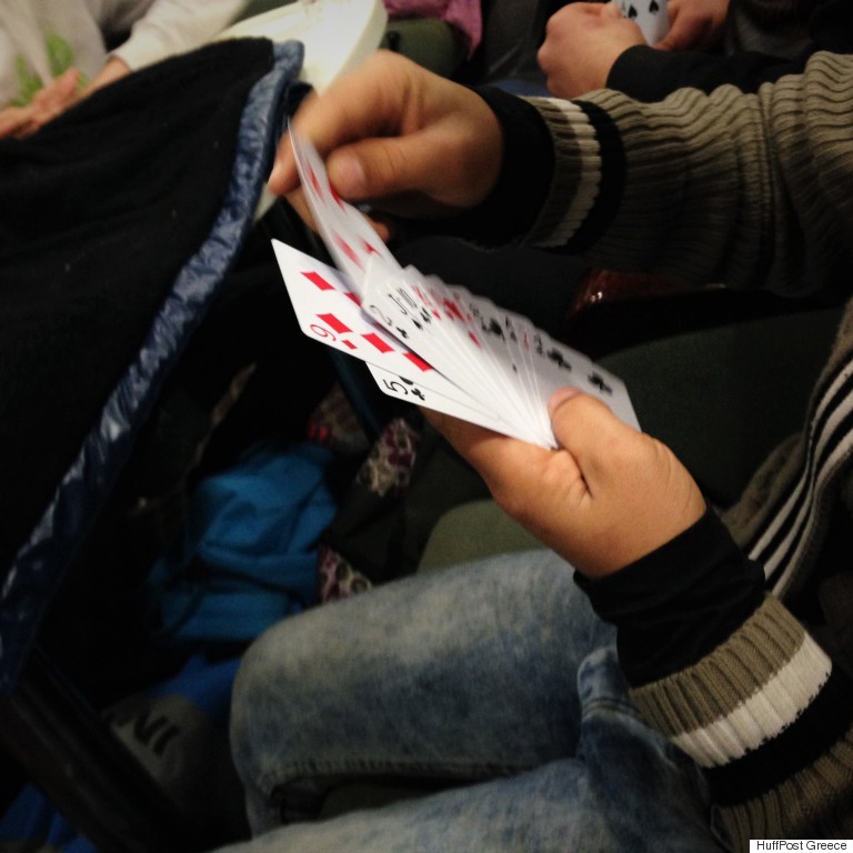 Τα δύο παιδιά από το Αφγανιστάν έχουν ήδη κοιμηθεί. Το άλλο κάθεται στην καρέκλα του και παρατηρεί γύρω του. Τα κορίτσια από την Ερυθραία ζωγραφίζουν και τα υπόλοιπα παιδιά παίζουν χαρτιά με τον διερμηνέα και την Χριστίνα. Ένα παιχνίδι της Συρίας που όπως μου εξηγούν είναι κάτι μεταξύ ξερής και πρέφας. Αντί για τσόχα έχουν στρώσει το fleece μπουφάν του Aνάς για να μην γλιστράνε τα φύλλα. Ο Ομάρ δεν παίζει. Κάθεται στην καρέκλα του και είναι πολύ ανήσυχος. Κουνάει το πόδι του συνεχώς. «Τι έχεις» τον ρωτάει η Χριστίνα, ενώ τα χέρια της είναι γεμάτα χαρτιά. «Δεν μπορώ! Μου έχει κολλήσει στο μυαλό η μητέρα μου. Έχω τρελαθεί!» της απαντά με τα λίγα αγγλικά που ξέρει. Νιώθεις τόσο μικρός που δεν μπορείς να τον βοηθήσεις. Η έλλειψη προσοχής της Χριστίνας από το παιχνίδι εκνευρίζει τα άλλα παιδιά, που είναι έτοιμα να κερδίσουν. «Παίξε, σου λένε τα παιδιά» της μεταφέρει ο διερμηνέας. Μόλις τελειώσει η παρτίδα (με τα παιδιά φυσικά κερδισμένα) η Χριστίνα μου δίνει τη θέση της στο τραπέζι και πάει κοντά στον Ομάρ (μη ρωτάτε, έχασα πανηγυρικά!).