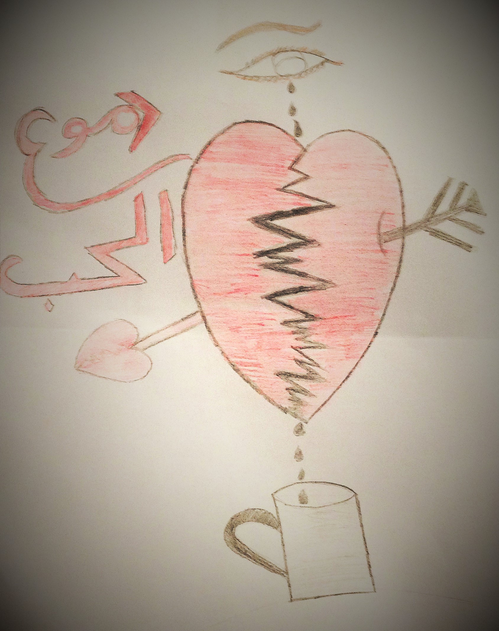 Διακρίνω μια καρδιά με ένα βέλος, σαν να αιμορραγεί σε μια κούπα. Από πάνω της ένα μάτι. Και δίπλα έχει γράψει κάτι στα αραβικά. «Γράφει κάτι εδώ;», ρωτάω τον διερμηνέα. «Ναι. Τα δάκρυα της καρδιάς». Αποφάσισε να κάνει δώρο τη ζωγραφιά στη Χριστίνα. Αλλά φρόντισε να μην με αφήσει παραπονεμένη. Ζωγράφισε μετά και για εμένα ένα αγοράκι με τα μαλλιά του Φίντο Ντίντο. Και ο Μοχάμεντσυμπλήρωσε δίπλα ένα μικρό σκιτσάκι.