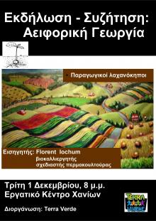 Την Τρίτη 1/12 στις 20:00 η TERRA VERDE οργανώνει στο εργατικό κέντρο (Μπότσαρη 68) εκδήλωση συζήτηση για την αειφορική γεωργία με εισηγητή τον Florent Iochum, σχεδιαστή permaculture.