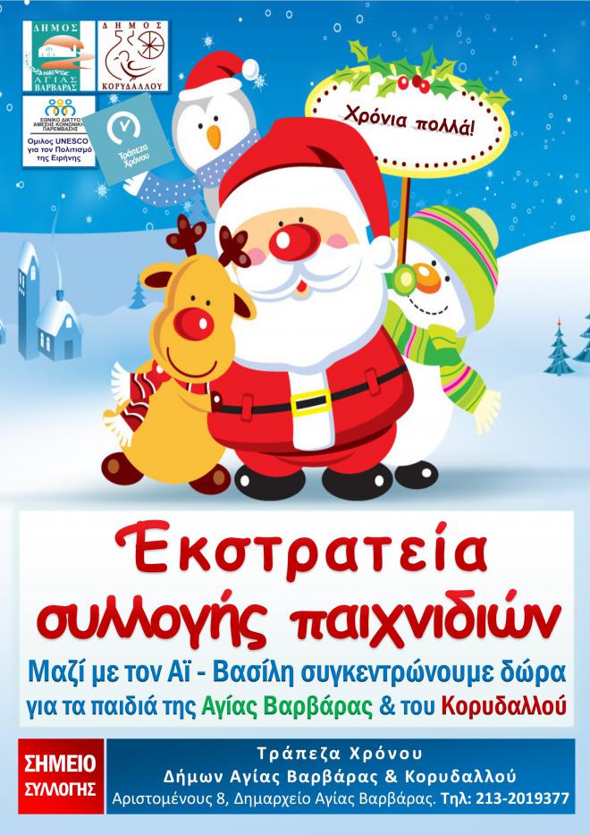 Η Τράπεζα Χρόνου Δήμων Αγίας Βαρβάρας και Κορυδαλλού διοργανώνει εκστρατεία συλλογής παιχνιδιών, για να τα προσφέρει στα παιδιά οικογενειών οι οποίες εντάσσονται στις Κοινωνικές Δομές Αντιμετώπισης της Φτώχειας.