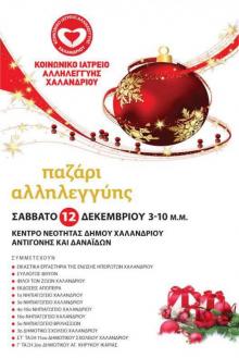 Το Σάββατο 12 Δεκεμβρίου 2015, από τις 3 μ.μ. ως τις 10 μ.μ., στο Κέντρο νεότητας του Δήμου Χαλανδρίου θα γίνει παζάρι αλληλεγγύης και τα έσοδα θα διατεθούν για την ενίσχυση του Κοινωνικού Ιατρείου Αλληλεγγύης Χαλανδρίου.