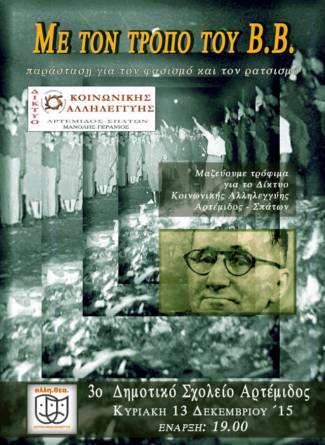 Την Κυριακή 13/12/15, η Θεατρική Ομάδα Αλληλεγγύης «ΑΛΛΗ.ΘΕΑ.» θα παρουσιάσει στο 3ο Δημοτικό Σχολείο Αρτεμιδος την σκηνική σύνθεση «Με τον τρόπο του Β.Β.».