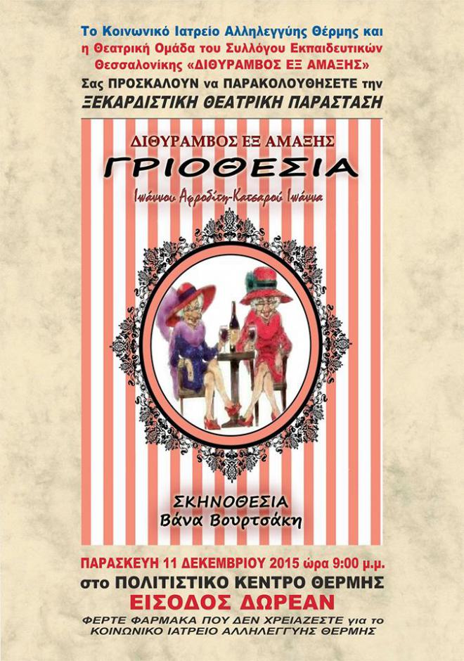 Το Κοινωνικό Ιατρείο Αλληλεγγύης Θέρμης και η θεατρική ομάδα του συλλόγου των εκπαιδευτικών Θεσσαλονίκης "Διθύραμβος εξ αμάξης" σας προσκαλούν να παρακολουθήσετε την Θεατρική παράσταση "ΓΡΙΟΘΕΣΙΑ" στο Πολιτιστικό Κέντρο Θέρμης την Παρασκευή 11/12 και ώρα 9μμ.