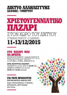 Χριστουγεννιάτικο παζάρι από το Δίκτυο Αλληλεγγύης Δάφνης - Υμηττού Friday, 11 December, 2015 - 19:00 to Sunday, 13 December, 2015 - 14:00Διήμερο χριστουγεννιάτικο παζάρι από το Δίκτυο Αλληλεγγύης Δάφνης - Υμηττού. Να είστε όλοι εκεί! SHARE IT: Tweet CONTACT INFORMATION Γυμναστηρίου 10, Δάφνη