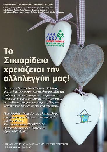 Οι Ενεργοί Πολίτες Νέου Ψυχικού - Φιλοθέης - Ψυχικού, μετέχουν στην προσπάθεια στήριξης των παιδιών με νοητική υστέρηση του Σικιαρίδειου Ιδρύματος - κέντρου κατάρτισης στο Μαρούσι με συλλογή τροφίμων και γραφικής ύλης και καλούν όσους πολίτες επιθυμουν να συνδράμουν.