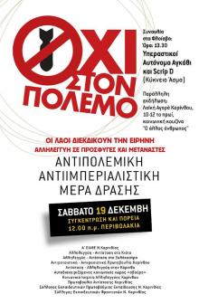 Σας περιμένουμε όλους το Σάββατο 19 Δεκέμβρη το πρωί 10.00π.μ. στη Λαική Αγορά όπου θα λειτουργήσει η κοινωνική κουζίνα "ο άλλος άνθρωπος", στις 12.00 π.μ. στα περιβολάκια για την αντιπολεμική πορεία με κατάληξη στο Φλοίσβο.Θα ακολουθήσει συναυλία με τους Υπεραστικούς και Αυτόνομο Αγκάθι - Scrip - D (Κύκνειο Άσμα)