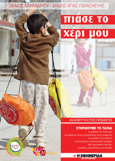 Το μεγάλο κύμα αλληλεγγύης προς τους πρόσφυγες συνεχίζεται μέσω των δράσεων της καμπάνιας «Πιάσε το χέρι μου», που συνδιοργανώνουν οι Δήμοι Αγίας Παρασκευής και Χαλανδρίου, η συνεταιριστική «Εφημερίδα των Συντακτών», η «Αλληλεγγύη για Όλους» και το Δίκτυο μεταναστριών στην Ελλάδα «Μέλισσα».