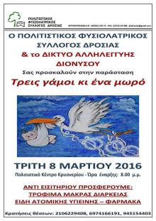 Η ξεκαρδιστική κωμωδία της θεατρικής ομάδας του Πολιτιστικού Φυσιολατρικού Συλλόγου Δροσιάς «Τρεις γάμοι κι ένα μωρό» παίζεται σήμερα Τρίτη 8/3 και ώρα 20.00 στο Πολιτιστικό κέντρο Κρυονερίου σε συνεργασία με το «Δίκτυο Αλληλεγγύης Διονύσου».