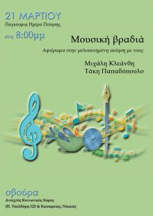 Με αφορμή την παγκόσμια ημέρα ποίησης η σβούρα οργανώνει μια βραδιά με σκοπό να τιμήσει μεγάλους Έλληνες ποιητές που άφησαν το στίγμα τους. Την Δευτέρα 21 Μαρτίου στις 8.00 μ.μ. σας καλούμε σε ένα μουσικό αφιέρωμα στη μελοποιημένη ποίηση.