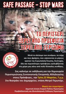 Σας καλούμε σε εκδήλωση για την Περιστεριώτικης Συντονιστικής Επιτροπής Αλληλεγγύης στους Πρόσφυγες, την Τρίτη 22 Μαρτίου στις 7μμ στο θεατράκι του Δημαρχείου, στάση μετρό Περιστέρι.