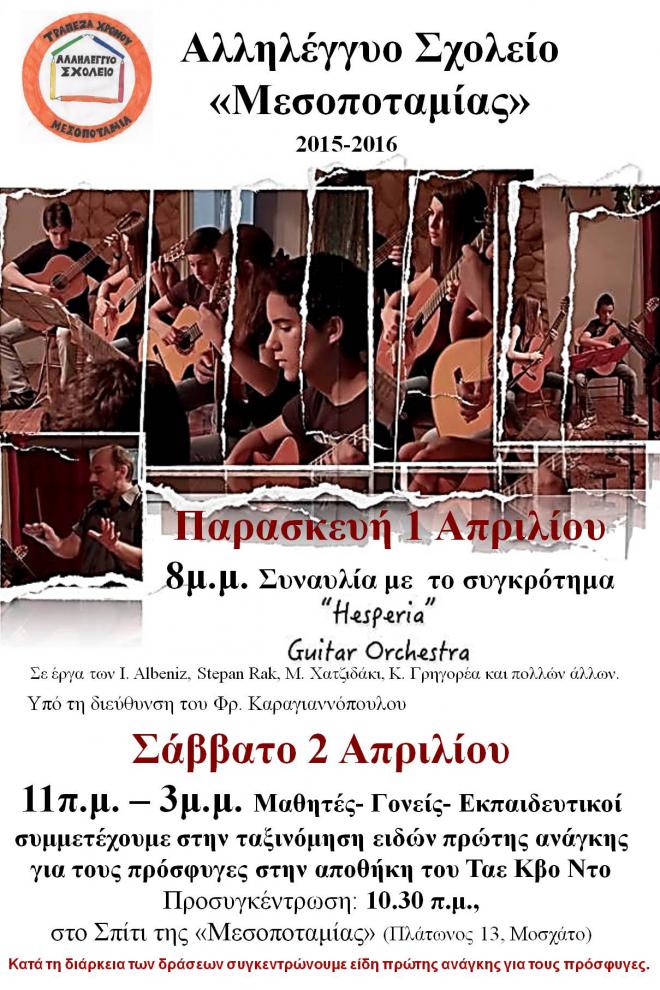 Το Αλληλέγγυο Σχολείο της Τράπεζας Χρόνου της Μεσοποταμίας, με βάση την απόφαση της τριμηνιαίας συνέλευσής του, διοργανώνει δύο ημέρες δράσεων κοινωνικού και πολιτιστικού χαρακτήρα, την Παρασκευή 1 και το Σάββατο 2 Απριλίου, στο σπίτι της «Μεσοποταμίας», Πλάτωνος 13, Μοσχάτο.
