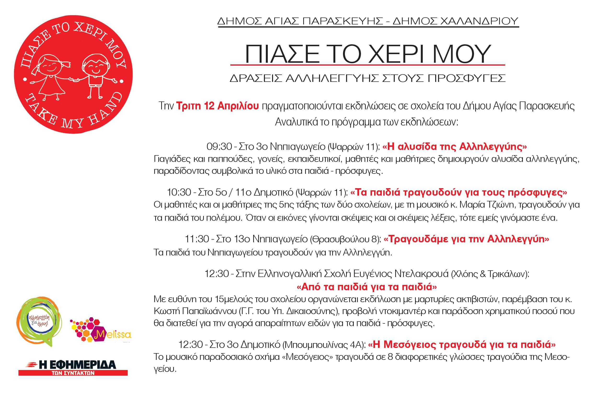 Με εκδηλώσεις σε σχολεία του Δήμου Αγίας Παρασκευής συνεχίζονται την Τρίτη 12 Απριλίου οι δράσεις της καμπάνιας «Πιάσε το χέρι μου», που διοργανώνουν από κοινού οι Δήμοι Αγίας Παρασκευής και Χαλανδρίου, η συνεταιριστική «Εφημερίδα των Συντακτών», η «Αλληλεγγύη για Όλους» και το Δίκτυο μεταναστριών στην Ελλάδα «Μέλισσα».