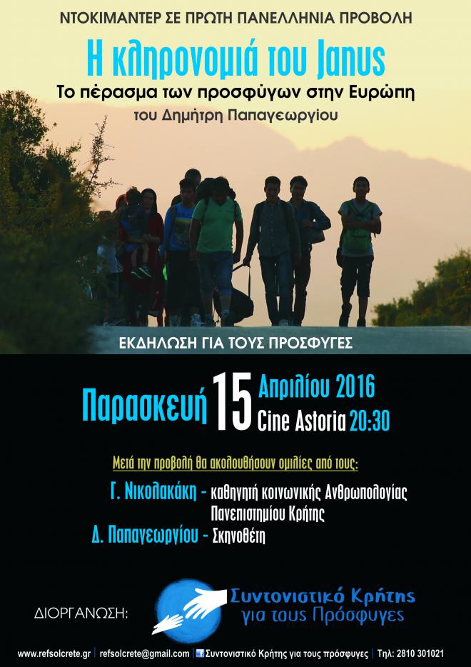 Στην εκδήλωση θα προβληθεί σε πρώτη πανελλήνια προβολή το ντοκιμαντέρ του Δημήτρη Παπαγεωργίου «Η κληρονομιά του Janus: Το πέρασμα ενός πρόσφυγα στην Ευρώπη» (“Janus’s Legacy: Refugee Passage to Europe”).
