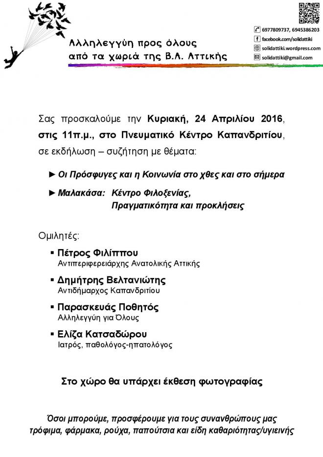 Εκδήλωση - συζήτηση για το προσφυγικό οργανώνει η "Αλληλεγγύη προς όλους από τα χωριά της Β.Α. Αττικής", την Κυριακή των Βαΐων, 24/4/16 στις 11π.μ., στο Πνευματικό Κέντρο Καπανδριτίου, με θέματα: