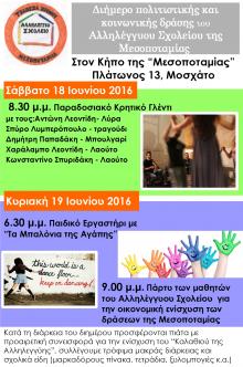 Το Αλληλέγγυο Σχολείο της Τράπεζας Χρόνου της “Μεσοποταμίας”, συζήτησε, αποφάσισε και διοργανώνει το τρίτο,για τη φετινή χρονιά, διήμερο δράσεων κοινωνικού και πολιτιστικού χαρακτήρα, το Σάββατο 18 και την Κυριακή 19 Ιουνίου, στον κήπο της “Μεσοποταμίας”, Πλάτωνος 13, Μοσχάτο.