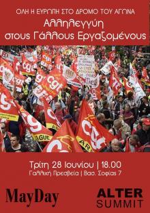 Ως πρωτοβουλία για την ουσιαστική επαναφορά των συλλογικών συμβάσεων συμμετέχουμε στο κάλεσμα του Alter Summit για μια πανευρωπαϊκή μέρα αλληλεγγυής στους Γάλλους Εργαζόμενους που αντιστέκονται στην απορρύθμιση των εργασιακών σχέσεων.