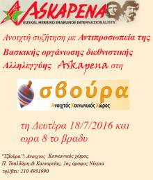 Αντιπροσωπεία της οργάνωσης διεθνιστικής αλληλεγγύης από την Χώρα των Βασκων θα επισκεφτεί την Νίκαια την ερχόμενη Δευτέρα 18/7. Θα τους φιλοξενήσουμε στην ταράτσα της Σβούρας στις 8 το βράδυ για να κάνουμε μια ανοιχτή συζήτηση γυρω από την κατασταση στις χώρες μας και να ανταλλάξουμε εμπειρίες..