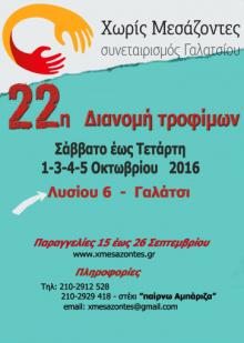 Προχωράμε στην 22η Διανομή τροφίμων από τον Συνεταιρισμό «Χωρίς Μεσάζοντες Γαλατσίου» από το Σάββατο 1 Οκτωβρίου έως την Τετάρτη 5 Οκτωβρίου 2016.