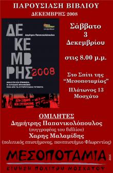 Η Κίνηση Πολιτών Μοσχάτου "Μεσοποταμία" διοργανώνει παρουσίαση του βιβλίου του Δημήτρη Παπανικολόπουλου: "Δεκέμβρης 2008 Ανάλυση και ερμηνεία - Οι αιτιώδεις μηχανισμοί πίσω από τα συγκρουσιακά γεγονότα", που κυκλοφορεί από τις εκδόσεις των συναδέλφων, το Σάββατο 3 Δεκεμβρίου στις 8μ.μ., στο Σπίτι της Μεσοποταμίας, Πλάτωνος 13, Μοσχάτο.