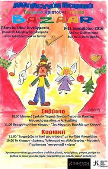 Από τις 9 έως τις 11 Δεκεμβρίου (10πμ με 9μμ) στην πλατεία Αλληλεγγύης (34ου Συντάγματος Πεζικού πλησίον Σκαβενίτη) πραγματοποιείται τριήμερο bazaar με χριστουγεννιάτικα χειροποίητα στολίδια, γλυκά, κοσμήματα, ρούχα και βιβλία. Όσο για τους μικρούς μας φίλους, face painting και πολλές, πολλές εκπλήξεις!