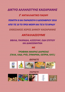 Βιβλία, παιχνίδια, αξεσουάρ, είδη σπιτιού και διακοσμητικά ανταλλάσσονται με γάλα, λάδι, ρύζι, ζυμαρικά όσπρια κλπ από το Δίκτυο Αλληλεγγύης Καισαριανής στο ανταλλακτικό παζάρι που οργανώνει την Πέμπτη στις 8 και την Παρασκευή στις 9 Δεκεμβρίου (10πμ-8μμ), στον εκθεσιακό χώρο του Δημαρχείο της Καισαριανής. Θα είμαστε όλοι εκεί!