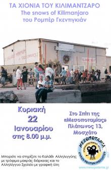 Συνεχίζουμε τις προβολές μας για το μήνα Ιανουάριο, αυτή την Κυριακή, 22/1/2017, με το φιλμ "Τα χιόνια του Κιλιμάντζαρο", του Ρομπέρ Γκεντιγκιάν (2011, Έγχρωμο, 90΄).