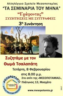Το Αλληλέγγυο Σχολείο της «Μεσοποταμίας» διοργανώνει το 3ο σεμινάριο για τη φετινή χρονιά, την Τετάρτη 8 Φεβρουαρίου 2017, στις 8.00μ.μ., στο Σπίτι της «Μεσοποταμίας», Πλάτωνος 13, Μοσχάτο.