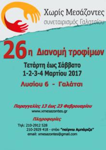 Προχωράμε στην 26η Διανομή τροφίμων από τον Συνεταιρισμό «Χωρίς Μεσάζοντες Γαλατσίου» από την Τετάρτη 1 έως Σάββατο 4 Μαρτίου 2017.