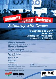 «Αλληλεγγύη ενάντια στη λιτότητα! Αλληλεγγύη με την Ελλάδα» ονομάζεται η εκδήλωση που διοργανώνει στο Βερολίνο στις 9 του Σεπτέμβρη η Ευρωομάδα της Αριστεράς GUE/NGL και το DIE LINKE, με τη συμμετοχή της «Αλληλεγγύης για Όλους» (Γιώργος Χονδρός), του «Κοινωνικού Ιατρείου Φαρμακείου Αλληλεγγύης Πειραιά», του Θανάση Μαρμαρινού (ψαρά της Λέσβου, υποψήφιου για το Βραβείο Νόμπελ Ειρήνης 2016), Γιώργου Αρχοντόπουλου (συνδικαλιστή από την Θεσσαλονίκη), Γιώργου Κατρούγκαλου (Αναπλ. Υπουργού Εξωτερικών), Στέλιου Κούλογλου (MdEP, GUE / NGL, δημοσιογράφου), της Γκάμπι Τσίμερ (MdEP, Προέδρου της GUE/NGL), εκπροσώπων κινημάτων και ακτιβιστών.