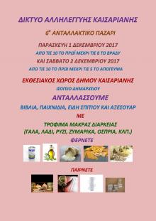 Το 6ο Ανταλλακτικό παζάρι του Δικτύου Αλληλεγγύης Καισιαριανής πραγματοποιείται την Παρασκευή 1 Δεκεμβρίου 2017, από τις 10 το πρωί μέχρι τις 8 το βράδυ, στον εκθεσιακό χώρο του Δήμου, που βρίσκεται στο ισόγειο του Δημαρχείου Καισαριανής. Στη δράση μας, ανταλλάσσουμε βιβλία, παιχνίδια, είδη σπιτιού και αξεσουάρ, με τρόφιμα μακράς διαρκείας (γάλα, λάδι, ρύζι, ζυμαρικά, όσπρια κλπ). Σας περιμένουμε!