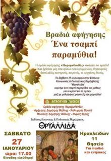 Βραδιά αφήγησης "Ένα τσαμπί παραμύθια!". Η ομάδα αφήγησης "Παραμυθανθός" σκάφτει το αμπέλι. Και βρίσκει μέσα στα φύλλα του κρυμμένους θησαυρούς, βασιλιάδες πονηρούς, πειρατές και αρχαίους θεούς. Σας περιμένουμε όλους/ες στην αφήγηση παραμυθιών το Σάββατο  27/1 και ώρα 5 μ.μ. με ελεύθερη είσοδο. Κερνάμε ένα τσαμπί παραμύθια και μύθους για το κρασί και το αμπέλι, μαζί με μεθυσμένες μουσικές και τραγούδια.