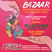 2ο Bazaar Μεταχειρισμένων Ρούχων στο Δίκτυο Αλληλεγγύης Βύρωνα, στις 10 και 11 Φεβρουαρίου 2018, από τις 10 το πρωί έως τις 6 το απόγευμα, στο χώρο του Δικτύου, Πίνδου 6.