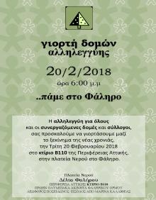 Η «Αλληλεγγύη για Όλους», οι συνεργαζόμενες δομές και οι σύλλογοι, σας προσκαλούν την Τρίτη 20 Φεβρουαρίου 2018, στις 6μμ, στο κτίριο Β110 της Περιφέρειας Αττικής, στην Πλατεία Νερού στο Φάληρο, για να γιορτάσουμε μαζί το ξεκίνημα της νέα χρονιάς!