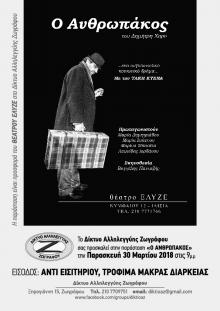 Το Δίκτυο Αλληλεγγύης Ζωγράφου σας προσκαλεί στην παράσταση "Ο Ανθρωπάκος" του Δημήτρη Χορν, την Παρασκευή 30 Μαρτίου 2018 στις 21:00. Είσοδος: Αντί εισιτηρίου, τρόφιμα μακράς διαρκείας.
